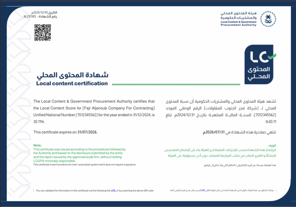أعلنت شركة فجر الجنوب للتصميم والإنشاءات (FJC) عن تجديد شهادة المحتوى المحلي التي تصدرها هيئة المحتوى المحلي والمشتريات الحكومية، وذلك بعد استكمال متطلبات التقييم المرتبطة بنسبة المحتوى المحلي في أنشطة الشركة. تُعد هذه الشهادة وثيقة رسمية تُظهر نسبة مساهمة الشركة في تعزيز المحتوى المحلي من خلال الاعتماد على الموارد والقدرات الوطنية في التشغيل والإنفاق والإدارة، بما يتماشى مع المعايير التنظيمية المعتمدة وأهداف رؤية المملكة 2030 لتعزيز النمو الاقتصادي والتنمية المستدامة.  تحقيق هذه الشهادة يعكس التزام FJC بتطبيق استراتيجيات فعّالة في زيادة ثقـل المصروفات المحلية، توظيف الكفاءات السعودية، وتعزيز السلع والخدمات الوطنية ضمن منظومة أعمالها، مما يُسهم في رفع مستوى تنافسيتها ويعزز فرصها في المنافسات والمشاريع المستقبلية في القطاعين العام والخاص.